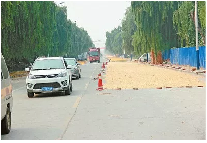 部分村民把马路当晒场,为防止汽车碾压,还在晾晒的粮食边摆放石头、木料等障碍物。一些人甚至对经过的车辆视若不见,径自收拾粮食,致使过往车辆不得不减速、避让,让人很是为他们的安全担心。