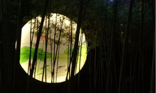 在傍晚的灯光的映照下,正面前有一排竹子,有风吹过,发出轻微的婆娑声。