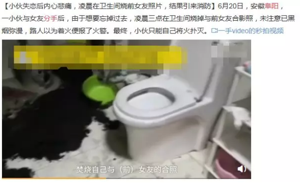 6月20日,安徽阜阳,一小伙与女友分手后,由于想要忘掉过去,凌晨三点在卫生间烧掉与前女友合影照,未注意已黑烟弥漫,路人以为着火便报了火警。最终,小伙只能自己将火扑灭。