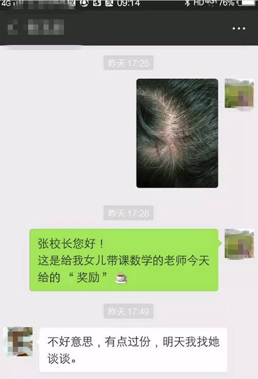 张校长介绍,昨天下午,他接到张女士的微信信息之后就在学校里做了调查,随后给张女士回了信息。“我了解到,事情发生在最后一节课上。”张校长说,当时老师上课的时候,婷婷一道题目做错了。随后老师又在黑板上写了一遍题目,结果婷婷又做错了。面对这种情况,老师的情绪激动起来,她抓起一柄学生用的尺子,打了婷婷的头。“老师当初有种对学生好的意愿,但她的行为确实过激了。” 张校长表示,无论如何,体罚学生是错误的。