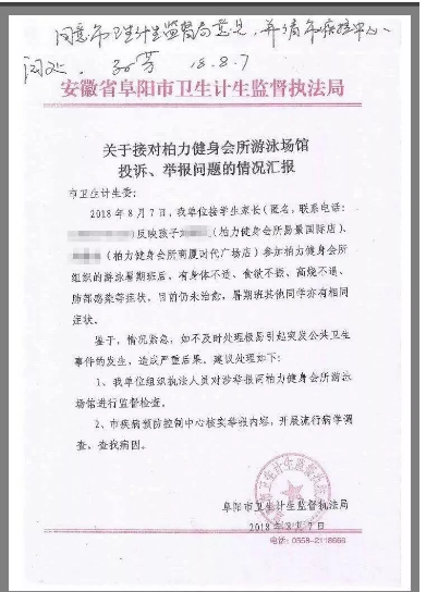 有市民反映:阜阳柏力健身游泳池,疑似让几个去游泳的孩子产生不适反应阜阳市卫计委今天去调查了!