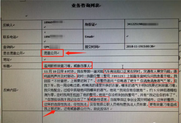 11月25日,一条发自安徽阜阳交警官方微博的帖文引起了不少网友的关注。一名政府工作人员面对交警例行检查时,因不满交警检查耽误了时间,遂通过网站投诉执勤交警,称交警滥用职权刁难、威胁当事人。当地警方经调